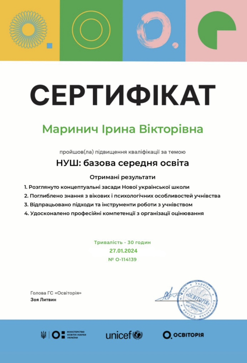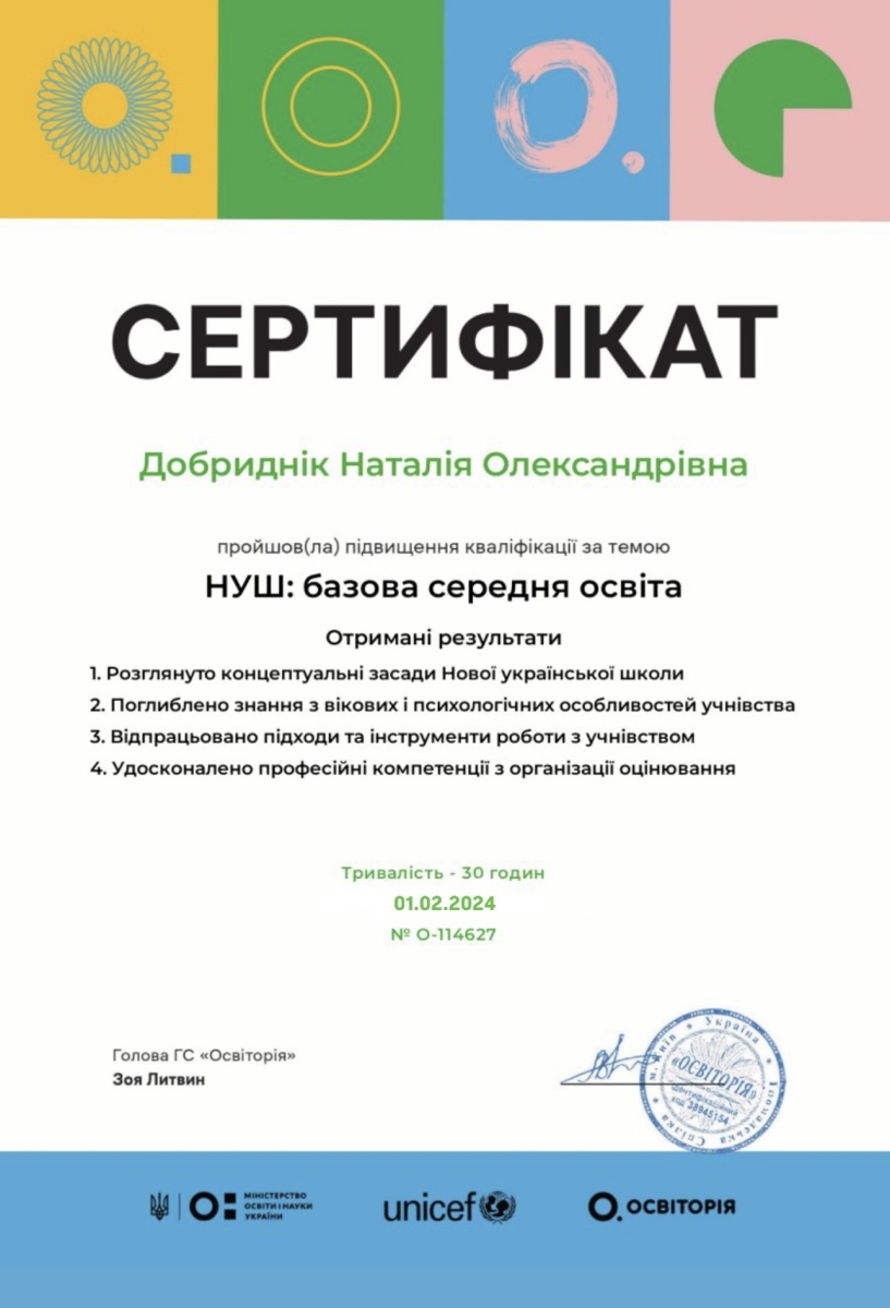 Грицай Наталія Богданівна - сертифікат1, сертифікат2, сертифікат_Природничі науки, сертифікат_Формувальне_оцінювання, сертифікат_Інформбезпекасертифікати 2023-2024 сертифікат Інклюзивна освіта1Інклюзивна освіта2, Інклюзивна освіта3