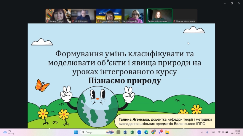 2 грудня 2025 року у межах вивчення освітнього компонету «Методика навчання природничих дисциплін (інтегровані курси)» для здобувачів вищої освіти освітньо-професійних програм «Середня освіта (Природничі науки)» та «Середня освіта (Біологія та здоров’я людини)» бакалаврського рівня підготовки Університету Григорія Сковороди відбувся вебінар «Формування умінь класифікувати та моделювати об’єкти і явища природи на уроках інтегрованого курсу «Пізнаємо природу»». Захід провела Галина Василівна Ягенська – доцентка кафедри теорії і методики викладання шкільних предметів Волинського інституту післядипломної педагогічної освіти, учителька біології та курсу «Пізнаємо природу» Луцького ліцею №21 імені Михайла Кравчука, співавторка підручників з біології та курсу «Пізнаємо природу» видавничого дому «Освіта», тренерка НУШ з природничої освітньої галузі.