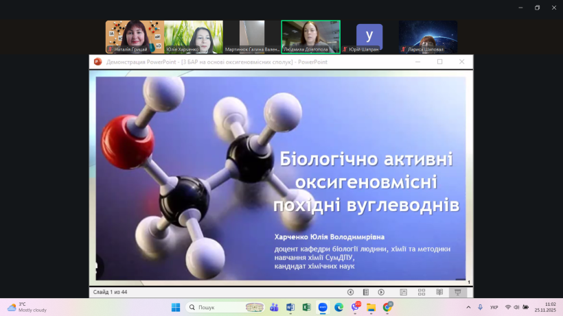 25 листопада 2025 року здобувачі освітніх програм "Середня освіта (Природничі науки)", "Середня освіта (Хімія)", "Середня освіта (Біологія та здоров'я людини)" та викладачі кафедри природничих наук психолого-природничого факультету РДГУ відвідали гостьову лекцію з теми "Біологічно активні оксигеновмісні похідні вуглеводнів", яку провела Юлія ХАРЧЕНКО – кандидатка хімічних наук, доцентка кафедри біології людини, хімії та методики навчання хімії Сумського державного педагогічного університету імені А. С. Макаренка.